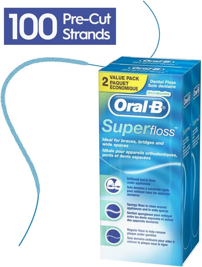 El hilo dental Super Floss de Oral B te ayudara a conseguir una limpieza dental profunda y al mismo tiempo mejorara la salud de tus encías ayudando en casos de sangrado gingival y mal aliento (halitosis).